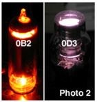 GAS (Photo 2)- produces a blue haze, generally confined to the vicinity of the mount structure. The proper function of gas types such as thyratrons, voltage regulator and voltage reference tubes, requires the presence of this glow as an indication of proper tube operation. Some voltage regulators use neon instead of argon and as a result exhibit a pink-orange glow. It is, however, a distinct detriment in vacuum receiving types, where the presence of gas in large amounts can cause malfunction of the equipment.”