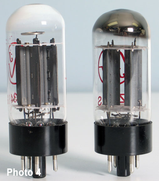 The only time the getter color will indicate a problem is when it turns white. A tube with a white getter will not function and cannot be used. This happens when air leaks into the tube. See Photo 4 for an example of this. The tube on the left has lost it's vacuum and no longer functions. The tube on the right is a normal functioning tube.